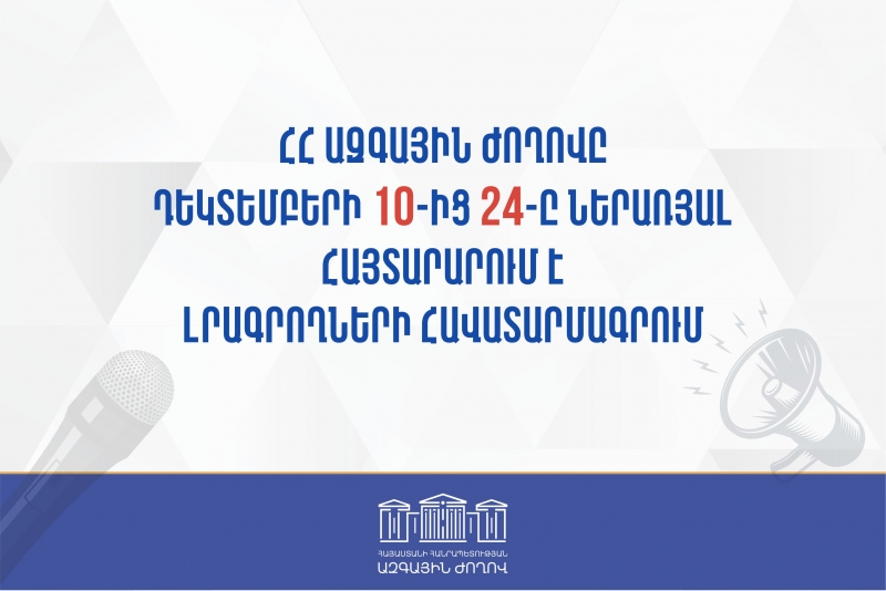 Կառավարության նախաձեռնությամբ դեկտեմբերի 16-ին կգումարվի ԱԺ արտահերթ նիստ Հայաստանի Հանրապետության Սահմանադրության 100-րդ եւ «Ազգային ժողովի կանոնակարգ» սահմանադրական օրենքի 41-րդ հոդվածների համաձայն` Կառավարության նախաձեռնությամբ 2025 թվականի դեկտեմբերի 16-ին` ժամը 11:00-ին, ԱԺ նախագահի որոշմամբ կգումարվի Ազգային ժողովի արտահերթ նիստ` նախաձեռնողի սահմանած օրա... Արտահերթ նիստեր կգումարեն ԱԺ մշտական հանձնաժողովները Առողջապահության հարցերի մշտական հանձնաժողովը դեկտեմբերի 12-ին՝ ժամը 12:00-ին, 414 սրահում կգումարի արտահերթ նիստ: Դեկտեմբերի 15-ին՝ ժամը 11:00-ին, 214 դահլիճում տեղի կունենա ԱԺ տնտեսական հարցերի մշտական հանձնաժողովի արտահերթ նիստ: ... ՀՀ ԱԺ աշխատակազմը հայտարարում է լրագրողների հավատարմագրում ՀՀ ԱԺ աշխատակազմը 2025 թվականի դեկտեմբերի 10-ից 24-ը ներառյալ կիրականացնի ՀՀ Ազգային ժողովի 8-րդ գումարման 11-րդ նստաշրջանի գործունեությունը լուսաբանող լրագրողների հավատարմագրում: ՀՀ Ազգային ժողովում լրագրողների հավատարմագրման կարգի 5-րդ կետի համաձայն` լրագրողին հավատարմագրելու նպատակով լրատվական գո... Կայացել է Հայաստանի եւ Վրաստանի խորհրդարանների ոլորտային հանձնաժողովների համատեղ երրորդ նիստը Թբիլիսիում դեկտեմբերի 8-ին տեղի է ունեցել ՀՀ Ազգային ժողովի արտաքին հարաբերությունների մշտական հանձնաժողովի եւ Վրաստանի Խորհրդարանի արտաքին հարաբերությունների հանձնաժողովի համատեղ երրորդ նիստը Սարգիս Խանդանյանի եւ Նիկոլոզ Սամխարաձեի համանախագահությամբ: Նիստին մասնակցել են ՀՀ Ազգային ժողովի արտաքին հ... |